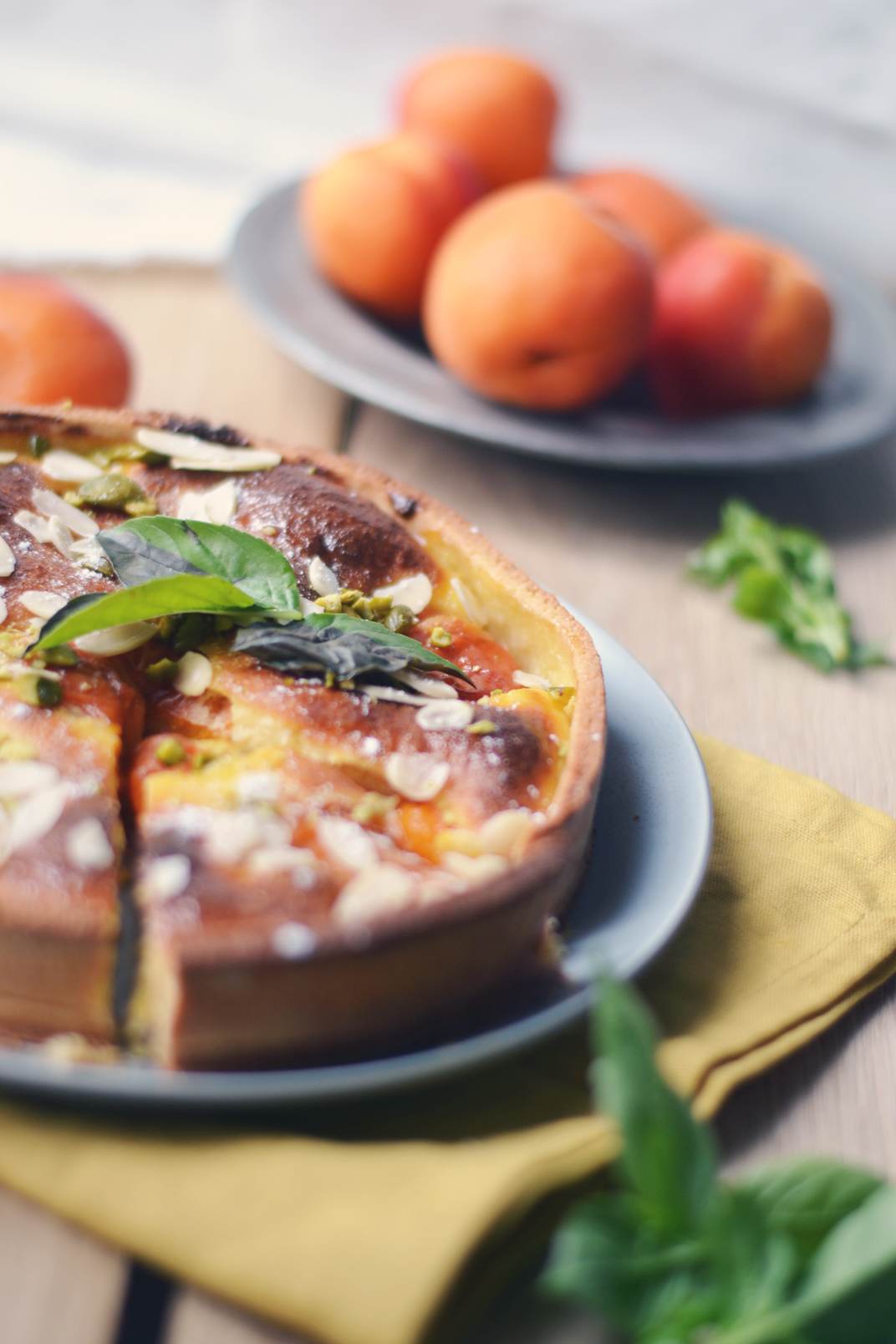 Ca y est les fruits d’été sont arrivés sur les étals des marchés et les cuissons de tartes aux fruits s’enchainent dans ma cuisine. C’est vraiment le dessert aux fruits que je préfère. Je trouve que les tartes sont aussi simples à réaliser que délicieuses. Quoi de plus simple que de réaliser sa pâte à tarte et de la garnir de ses fruits préférés agrémentés d’une petite compote, confiture ou crème amandine ? C’est cette dernière garniture que j’ai choisi pour accompagner mes petits abricots bien mûrs et sucrés dans ma pâte à tarte préférée. J’adore la crème amandine, je trouve qu’elle se marie parfaitement avec énormément de fruits et permet de varier un peu. Pour plus d’originalité et surtout pour plus de fraicheur, j’ai ajouté du basilic à ma recette. Comment ça vous n’y aviez jamais songé pour accompagner des abricots? C’est pourtant une délicieuse association. La fraicheur du basilic donne un véritable coup de fouet au sucre des abricots. Essayez cette tarte et vous verrez, vous aussi vous l’adopterez !